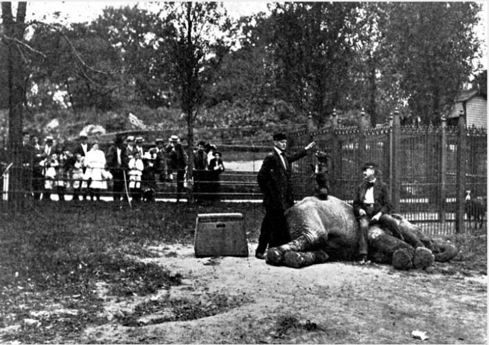 DUMBOS…According to a 1911 Department of Parks Annual Report, the menagerie at Central Park submitted animals to questionable treatment, as suggested by this photo of a trainer and a dog perched on top of an elephant. (nycgovparks.org)