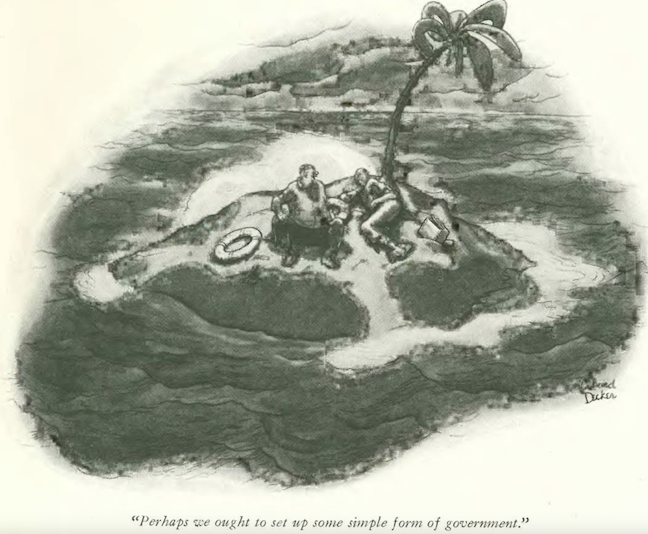 …while Richard Decker had these two castaways contemplating a simpler form of government…