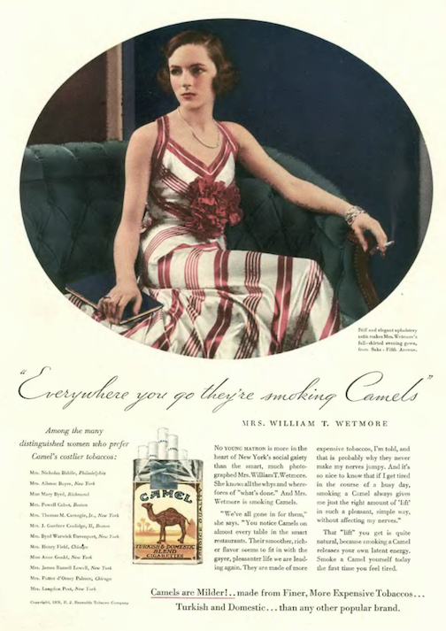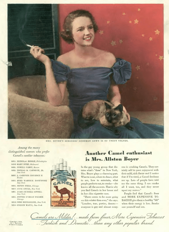 R.J. Reynolds continued to roll out its list of distinguished women who preferred their Camel cigarettes: “Mrs. Allston Boyer” nee Charlotte Young was a model with the John Robert Powers agency who was married to resorts planner Allston Boyer from 1934 to 1939. Young (1914–2012) would later marry New York Times Moscow correspondent Harrison Salisbury, and the two would embark on lengthy journeys throughout Asia, including a grueling 7,000-mile journey retracing the route of The Long March that Charlotte recounted in one of her seven travel books. Whether she continued her Camel habit is unknown, but she did live 98 years…