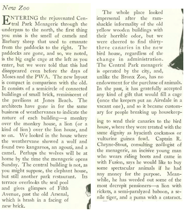 In his column “The Sky Line,” Mumford cast an envious gaze north toward Brooklyn’s Prospect Park Zoo, which he believed had greatly improved upon the recently rebuilt Central Park Zoo.