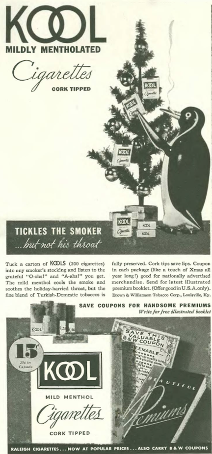 …while Spud’s new competitor in menthol cigs, KOOL, kept things simple with their smoking penguin mascot and valuable coupons for keen merchandise…