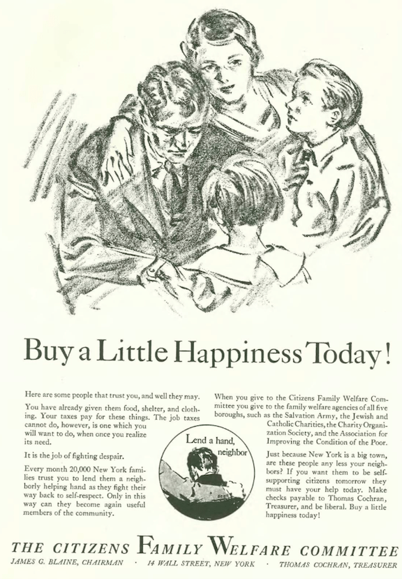 …the Citizens Family Welfare Committee offered this reminder that the Depression was still very much a challenge for 20,000 New York families…