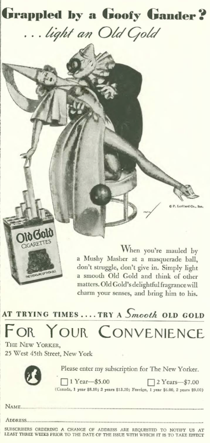 …the makers of Old Gold cigarettes (Lorillard) ran a series of ads featuring a sugar daddy and his leggy mistress…they were drawn by George Petty (1884–1975), famed for his “pin-up girls”…as an added bonus below the ad, you could renew your New Yorker subscription—two years for seven bucks…
