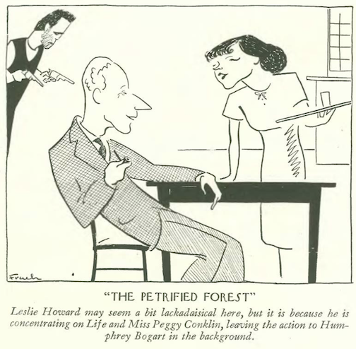 …on to our cartoonists, Al Frueh illustrated Humphrey Bogart as the coldblooded killer Duke Mantee in the 1935 play The Petrified Forest; the 1936 film adaptation would be Bogart’s breakout role in the movies…