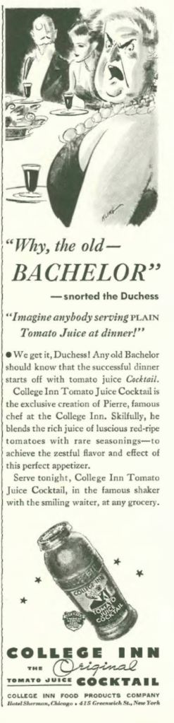 …I am puzzled by the “Duchess” types that appeared in food and beverage ads in the back of the magazine…we’ve seen some angry duchesses in ads for tomato and pineapple juice, and here we have one who has stooped so low as to shell her own peas…