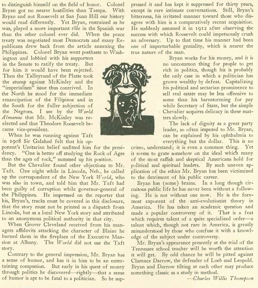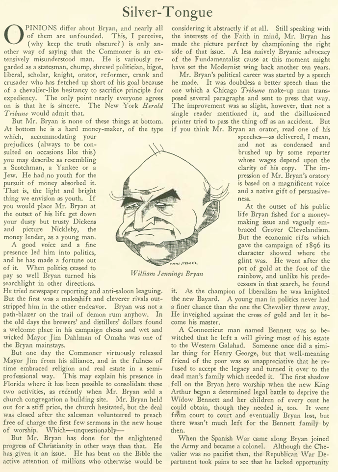 Leading up to the famous Tennessee “Monkey Trial” of John Scopes, the June 13 issue of The New Yorker continued its jabs at William Jennings Bryan.