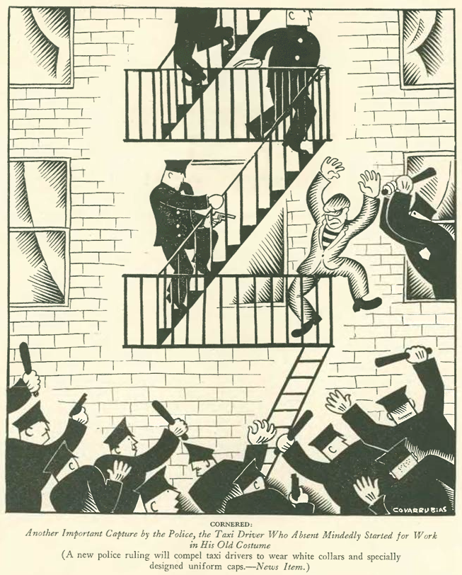 The New Yorker continued its assault on crooked cab drivers with this cartoon by Miguel Covarrubias: