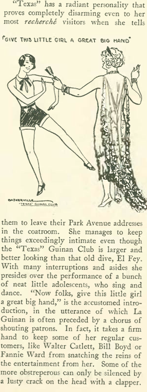Texas Guinan’s new club proved a be hit, as reported in the feature “When Nights Are Bold.” I last reported on Texas Guinan in my March 18, 2015 post, “A Dry Manhattan,” when prohibition officials put a padlock on her old haunt, the El Fey Club. As we see, things are looking up for the leading lady of New York nightlife…