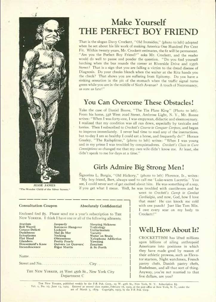 The June 13 issue opened with one such ad that appears to be a parody of a Bernarr Macfadden health and fitness promotion (Macfadden was an influential predecessor to the likes of Charles Atlas and Jack Lalanne). The ad was accompanied by a strange drawing that appears to combine McFadden’s body with–for some reason–William Jennings Bryan’s head: