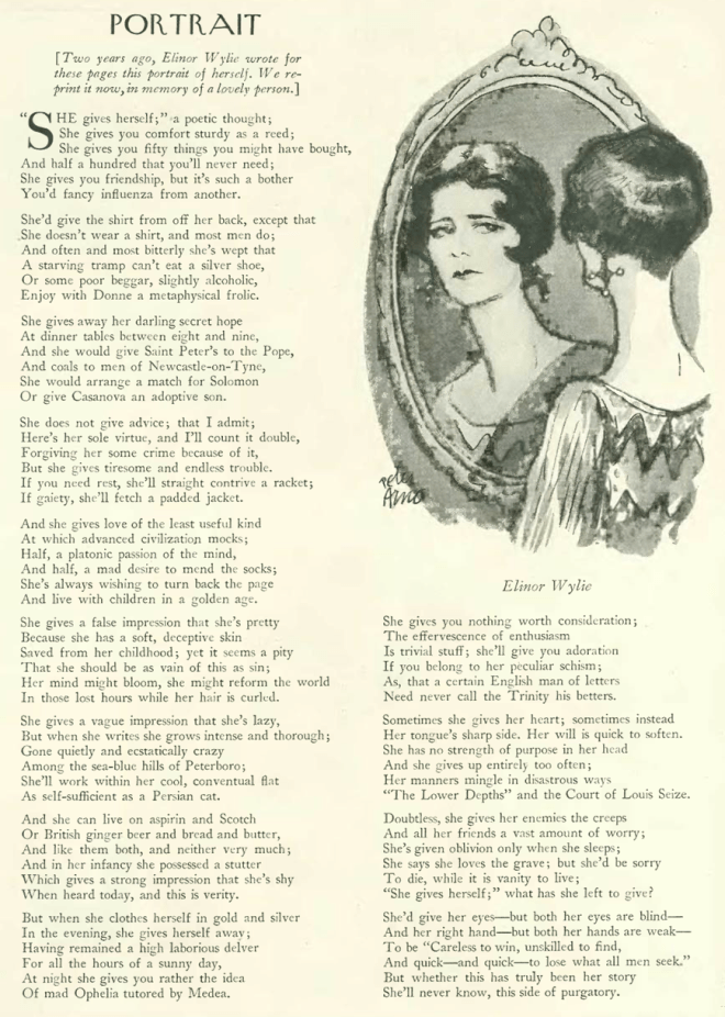 Elinor Wylie would contribute at least a dozen poems or short fiction pieces to the New Yorker between 1925 and 1929 (three of them posthumously). Her sister Nancy would contribute three pieces of short fiction (1927-28) and one poem, “These Vanities,” published in the March 12, 1927 issue: