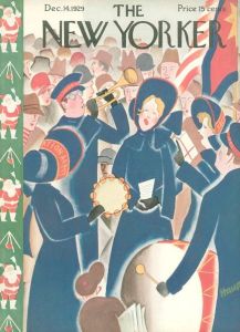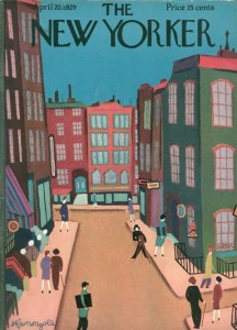September 21, 1935 cover by Ilonka Karasz. Antiques magazine (March 8, 2018) described Karasz’s covers as “leafy modernism,” evolving from “dynamic modern depictions of urban life to enchanting, peaceful images of leisure activities…recording details like family picnics or the insects and flowers in her garden.” Many depict scenes around Brewster, New York, where she lived with husband, Willem Nyland, a Dutch-American chemist and pianist. Karasz contributed 186 covers across six decades, beginning with her first on April 4, 1925.