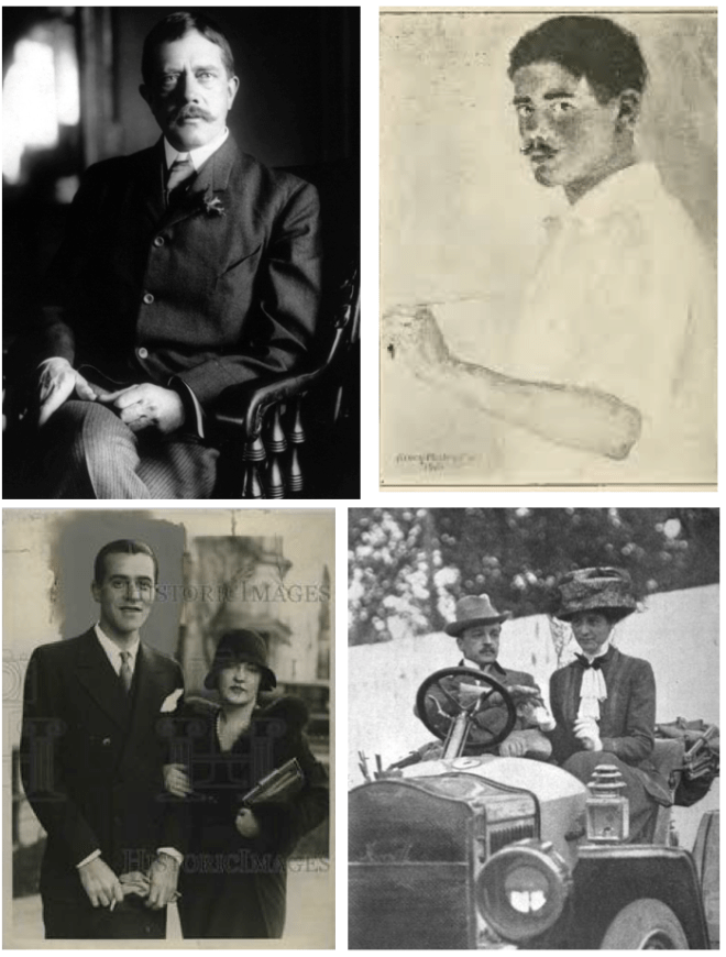 Top left, Henry Martyn Hoyt, Jr., U.S. Solicitor General and patriarch of the Hoyt family; in addition to Elinor Wylie and Nancy Hoyt, his children included (clockwise, from top right) the painter and poet Henry Martyn Hoyt III (in a self-portrait); Constance Hoyt (pictured riding in a car with Baron Ferdinand von Stumm-Halberg); and Morton Hoyt, seen here with his three-time wife Eugenia Bankhead. (Wikipedia, hokku.wordpress.com, theesotericcuriosa.blogspot.com, historic images.com)