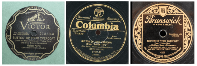 Today we associate popular songs with a particular performer or group, but in the first half of the 20th century most songs were recorded by many different artists, and such was the case with Ray Henderson’s hit “Button Up Your Overcoat” (from the musical comedy Follow Thru), recordings of which were available under three different labels by three popular artists of the day—Helen Kane, Zelma O’Neal, and Ruth Etting. As the New Yorker suggested, you could “pick your own fashions”…