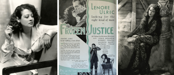 FEMME FATALE…Lenora Ulric, who made less than 20 films, was known for her work on the stage. At left, Ulric taking a break from her Broadway work in the early 1930s; center, magazine ad for Frozen Justice; at right, Ulric as the half-Eskimo Talu in Frozen Justice. (Pinterest/IMDB)