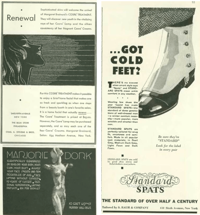 …a couple more ads from the back pages, the ones on the left appeal to women’s fitness, while the ad on the right tries its best to push a product that was fast going the way of the horse and buggy. Spats — devised in the late 19th century to protect one’s shoes and socks (then called stockings) — went out of fashion in the 1930s, no doubt because most streets were now paved and you didn’t have to worry about a passing wagon splashing mud and horseshit all over your shoes and ankles…