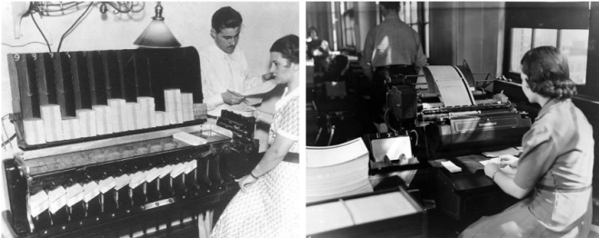 SHOCK OF THE NEW…At left, these young operators contemplate the operation of an IBM Type 80 horizontal Hollerith card sorter. The woman appears less than thrilled by the mechanical beast; at right, a woman operates a IBM 405 Alphabetic Accounting Machine, ca. 1934. It could process 150 cards a minute and keep track of multiple sums while printing data on continuous-sheet forms. (officemuseum.com/computerhistory.org)