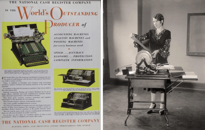 LOOKS COMPLICATED…At left, National Cash Register touted its business machines in this ca. 1930 ad; at right, a woman demonstrates a mimeograph machine in the 1920s. (Pinterest)