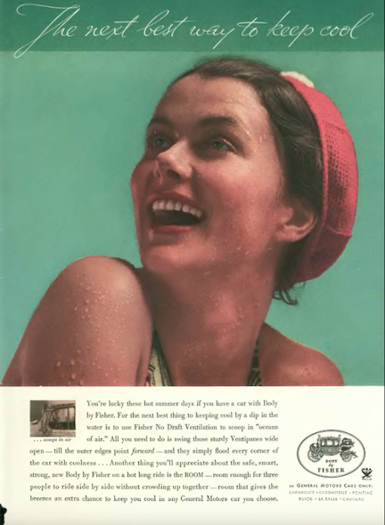We cool off by a taking a dip in the pool...er, rather by enjoying the "No Draft Ventilation" of a car body by Fisher...the model might want to stay in the pool, since air-conditioning in cars was still a good twenty years away...