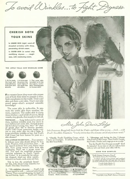 We kick off the ads with another Ponds celebrity endorsement from dancer and actress Francesca Braggiotti (1902-1998), who was married to actor, politician, and diplomat John Davis Lodge...