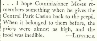 In my previous post E.B. White pondered the fate of the Central Park Casino, a favorite haunt of deposed Mayor Jimmy Walker and other members of the smart set who openly flouted Prohibition laws. In "Tables for Two," Lois Long made this observation (below) at the conclusion of her nightlife column, believing that Parks Commissioner Robert Moses would give the management a chance to lower food prices and allow common folks to enjoy its sumptuous atmosphere. Little did she know that Moses was feasting on a diet of revenge rather than food, and had plans to tear the place down, regardless of its lower prices.