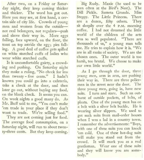 Anderson was a man of the world, so he knew exactly what Stewart’s was all about. But even the New Yorker wasn’t in the business of outing anyone, and editor Harold Ross, whose eccentricities included a puritanical strain, would not have allowed anything associated with “sexual deviance” to be printed in his magazine. Here is an excerpt from Anderson’s article, “Stewart’s, On the Square,” in which he subtly hints at the cafeteria’s “third life.”