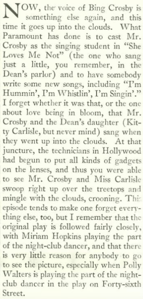 Film critic John Mosher always seemed upbeat about anything involving Disney, but given that animation was still in its infancy (its plastic trickery still rather novel), it didn't take much to outshine the otherwise drab fare (the "Grim") being coughed up by Tinseltown.