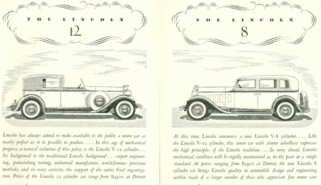 E.B. White provides us a nice segue into our advertising section, where desperate automakers vied for the attention of cash-strapped Americans, including the makers of the luxury brand Lincoln, who hoped to convince the upper-middles that this 8-cylinder model was every bit as good as their 12-cylinder monster…