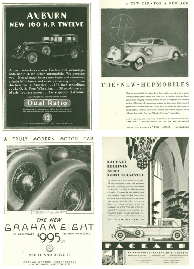 …and here are a few ads from companies long gone…like Pierce Arrow, Auburn (top left) struggled to sell its upscale cars during the Depression…however, the makers of another upscale brand, Packard (bottom right), were able to survive by favoring tried and true designs over gimmicky yearly changes…Hupmobile (top right) was known for its innovations, but a decision to build more expensive cars in the late 1920s put it into a bad position for the Depression-era market, and the company folded by 1939…when Hupmobile was on its last leg, it partnered with the ailing Graham-Paige Motor Company (bottom left), another company known for great designs, but combining two failing companies in this case yielded one larger failing company, and Hup and Graham went down together…