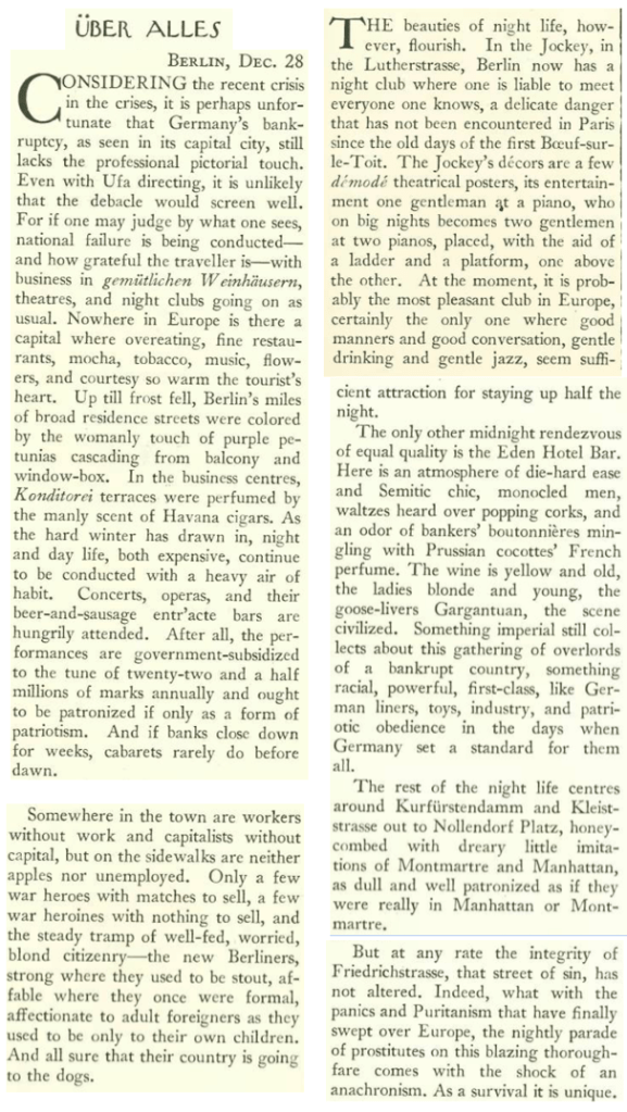 Toward the end of her article, Flanner noted that “Berliners are busy making a new race,” which is not a reference to Hitler’s “master race” (that would come later) but rather to a new generation overtaking the old. The final lines of this excerpt, however, suggest there might be trouble ahead…