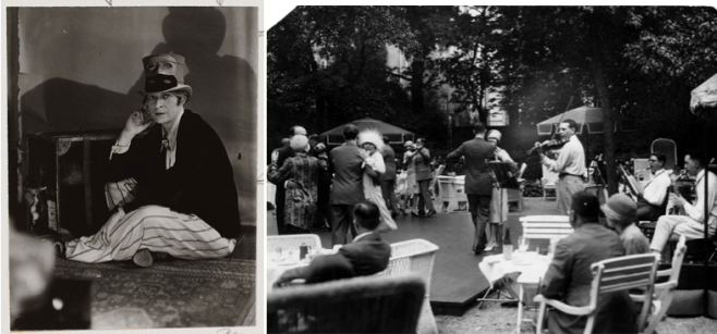 WORLDLY VIEW…Janet Flanner’s account of life in Berlin at the end of 1931 told of economic hardship and hinted at trouble to come, but it mostly depicted life as pictured at right at a Berlin tea dance. This was not a naive perspective, but rather one of a worldly mind not easily shocked by vice and upheaval. As The New Yorker’s longtime Paris correspondent, Flanner’s weekly letters during World War II would also make her a respected war correspondent. At left is an oft-reproduced portrait of Flanner, taken by Berenice Abbott in 1927. At right, a tea dance in the garden of the Hotel Esplanade in Berlin, 1928. (Clark Art Institute/ Süddeutsche Zeitung)