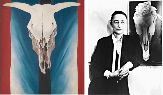 CHANGING HER TUNE…Georgia O’Keeffe’sCow’s Skull: Red, White, and Blue (1931); O’Keeffe with one of her skull paintings, 1931. (metmuseum.org/CSU Archives)